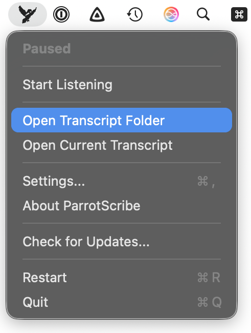 Click Open Transcript Folder in the menu to access your transcriptions.