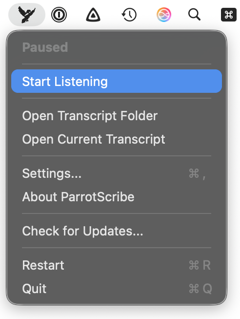 Transcriptions are saved to ~/Documents/ParrotScribe/.