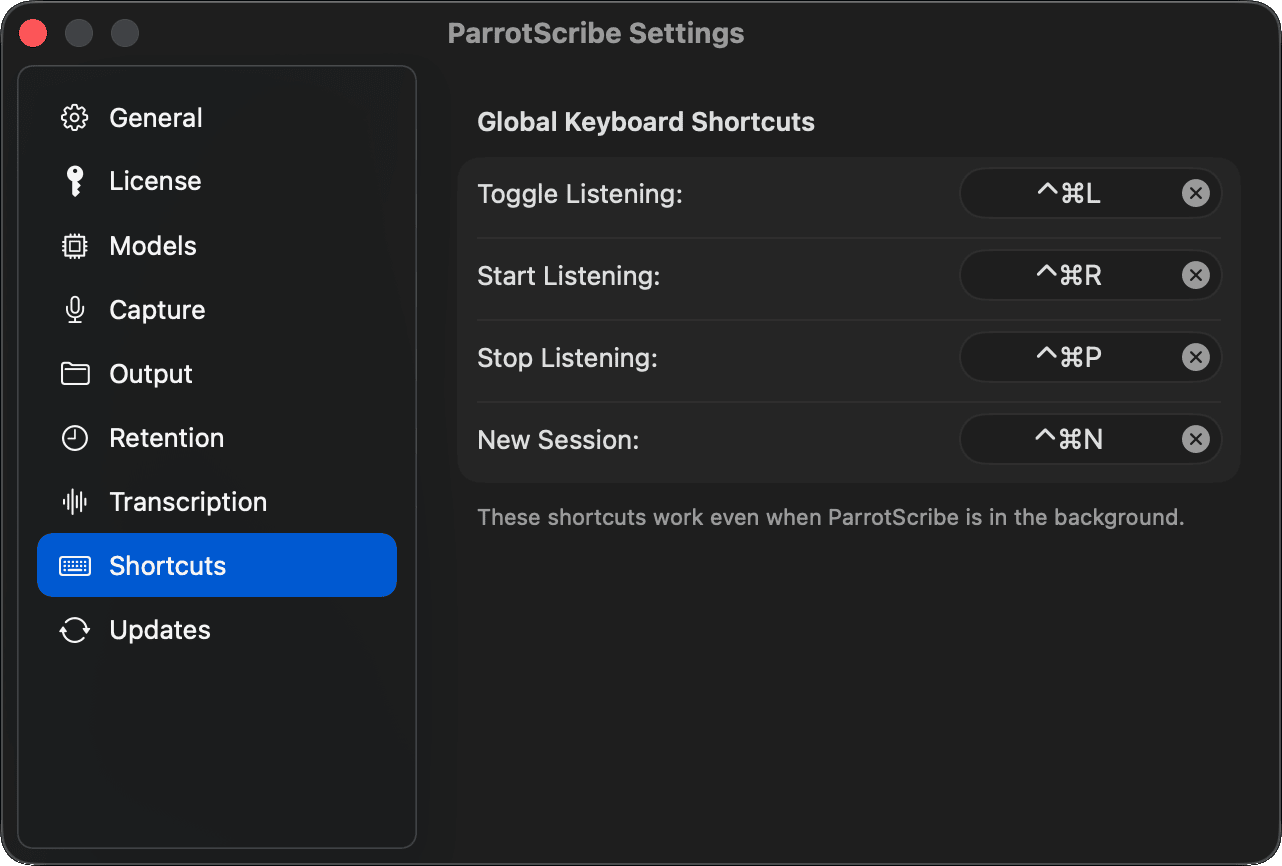 Configure global keyboard shortcuts that work even when ParrotScribe is in the background: