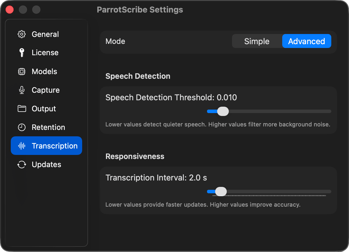 - Transcription Interval - Time between updates. Lower values provide faster updates, higher values improve accuracy.